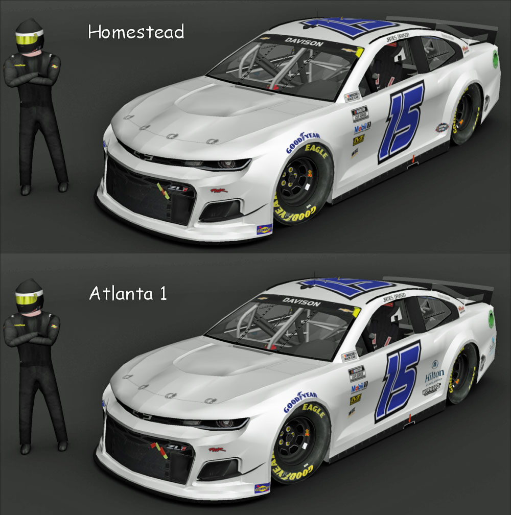 This time, a couple of simple schemes. 2021 #15 James Davison Camaros from Homestead and Allanta1. MENCS 2019 mod & template - Splash n' Go with Lefty updates to templates...... Sponsor logos from various internet sites and me...... Renders - The Mod Squad...... Screen Shot: